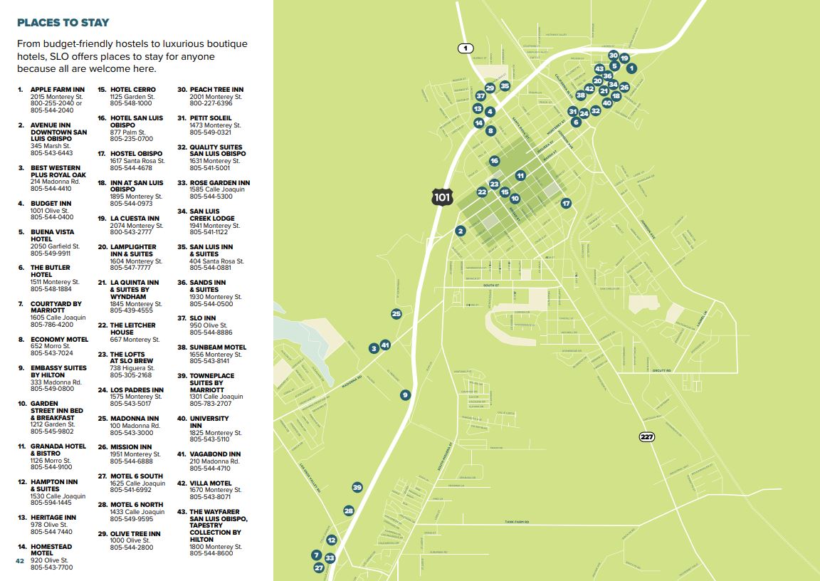 San Luis Obispo hotels offer a wide variety of accommodations including pet-friendly hotels, quaint inns, budget-friendly motels, corporate retreats, family-owned bed and breakfasts, and SLO-style homestays. Come for the Sustainable Ag Expo, stay for the weekend, and enjoy all that San Luis Obispo has to offer. The nearest airport is San Luis Obispo County Regional Airport.
