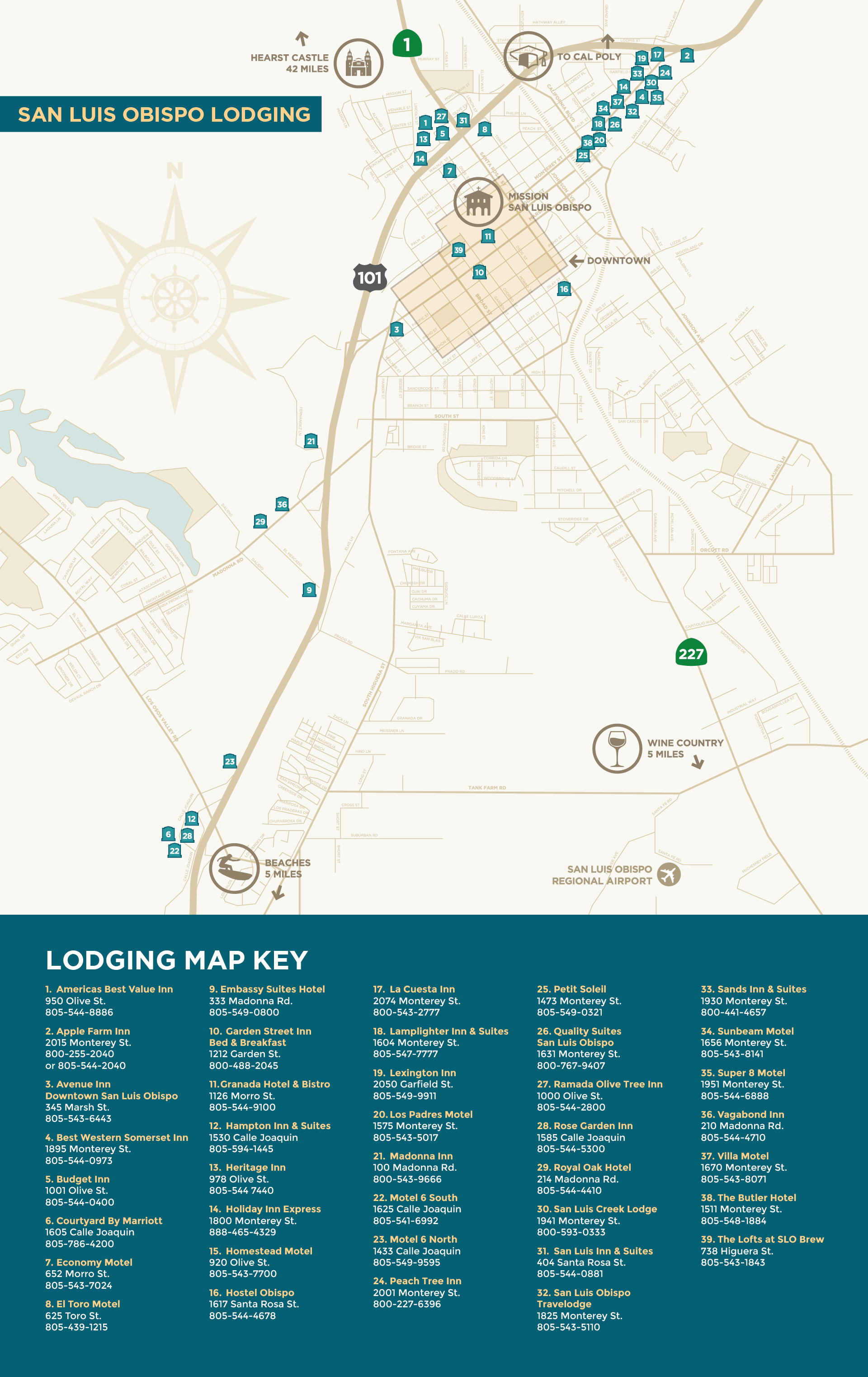 San Luis Obispo hotels offer a wide variety of accommodations including pet-friendly hotels, quaint inns, budget-friendly motels, corporate retreats, family-owned bed and breakfasts, and SLO-style homestays. Come for the Sustainable Ag Expo, stay for the weekend, and enjoy all that San Luis Obispo has to offer. The nearest airport is San Luis Obispo County Regional Airport.